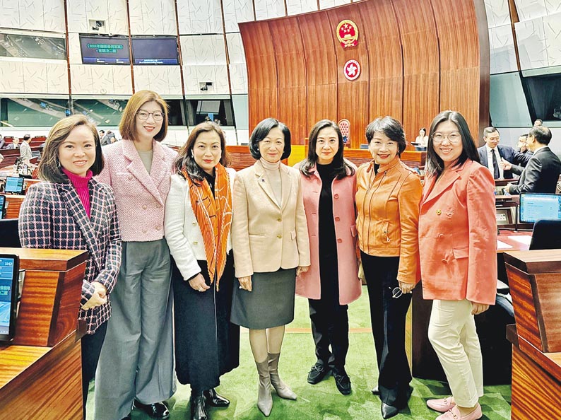 房屋局長何永賢同行會召集人葉劉淑儀身穿杏色外套,林琳、梁美芬著橙色,容海恩同葛珮帆就配搭粉紅色外套。會議開始前,葉太、葛珮帆、梁美芬等著咗鮮色衫嘅女議員合照,葛珮帆仲喺社交平台上傳相片,話係「以晨曦色彩迎接預算案」。
