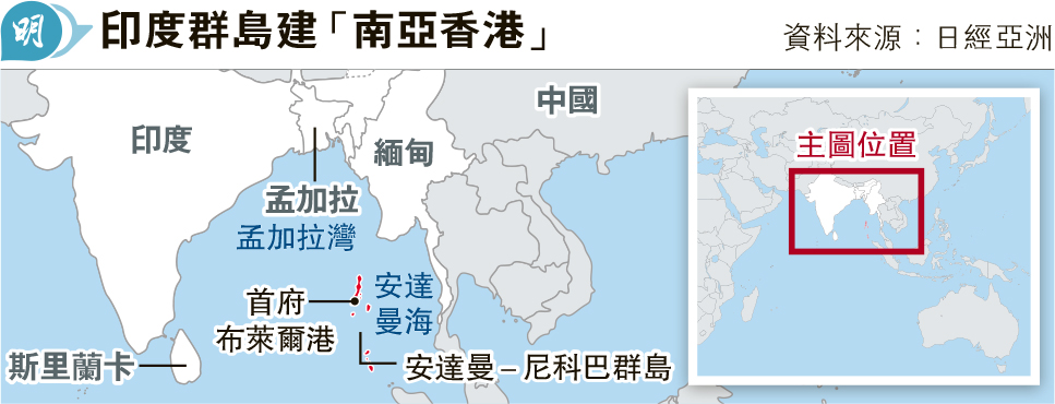 安達曼-尼科巴群島(Andaman and Nicobar Islands)面積1800平方公里,位於斯里蘭卡東面約1300公里,相比起印度本土,該處更接近緬甸和泰國等東南亞國家。《日經亞洲》周一(26日)報道,印度計劃斥資90億美元(約700億港元),令群島一部分搖身一變成為「南亞香港」,當中包括興建國際機場、貨運碼頭、旅遊設施、發電站和工業園等。報道稱,其中天然水深20米的港口將是印度去年公布2047海洋經濟藍圖的核心,政府認為它將能帶動區內經濟增長,亦會釋放當地作為貨運樞紐和旅遊目的地之潛力。