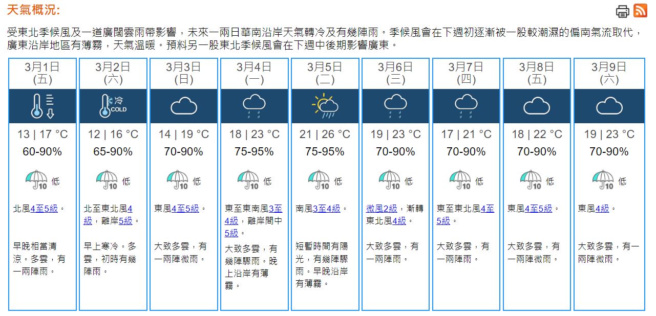 展望未來一兩日氣溫進一步下降,周六(3月2日)早上市區氣溫在13°C左右,新界再低兩三度。下周初氣溫逐步回升,有幾陣驟雨。(天文台)