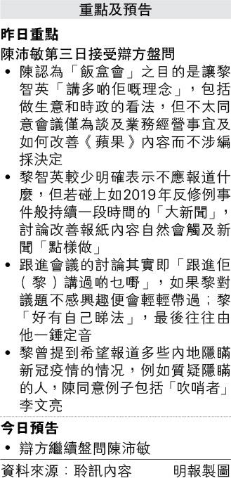 就黎智英成立「飯盒會」之目的,資深大律師彭耀鴻昨在第三日盤問陳沛敏時提出,黎可藉會議向員工表達他對經營公司業務和提升報道質素的看法,非為作出編採指示。陳不同意,指既然會議涉及如何改善報道質素,自然會談到「新聞要點做」,又稱黎「比較少講咩嘢唔要報」,但例如2019年反修例事件,黎會要求訪問示威者,「佢會講到個方向,例如想知多啲呢個人嘅心聲」。