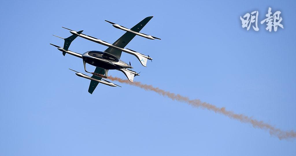 eVTOL由上海峰飛航空科技有限公司自主研發,本次是全球首度公開演示跨海、跨城飛行。它像直升機一樣垂直起飛,在空中會轉換成固定翼飛行,巡航速度可達每小時200公里,每次最多可載5人。