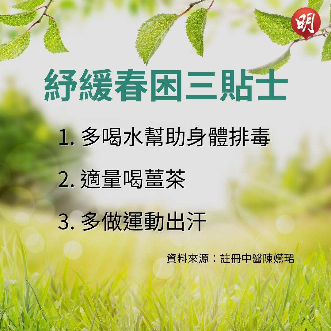 二十四節氣的驚蟄是春天節氣,註冊中醫陳嬿珺表示,此時天氣逐漸變暖,降雨量增加,惟天氣時暖時冷,身體容易產生濕氣,令人體產生濕邪,而冬天身體適應了寒冷天氣,當處於潮濕和相對溫暖的環境,身體會感到疲累不適。從中醫角度認為,春季是肝的季節,這段時期肝旺而脾弱,最重要是祛濕和補脾,同時清肝,保持心情開朗。陳嬿珺講解三個紓緩春困小貼士,以及介紹一款健脾湯水,疏肝活血。