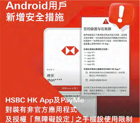 【明報專訊】匯豐銀行近期為Android裝置用戶嘅HSBC HK App同PayMe加入新功能,如果偵測到裝置上有非手機官方應用商店下載嘅App並授予過多權限,例如係「熒幕共享」或「完全控制您的手機」等,就會暫停用戶使用匯豐App。唔少網民關注日常使用手機習慣受影響,香港資訊科技商會榮譽會長方保僑就覺得一定會麻煩咗,但係從保安立場「大家都唔想唔見錢」,建議有需要嘅市民分開兩部電話使用。