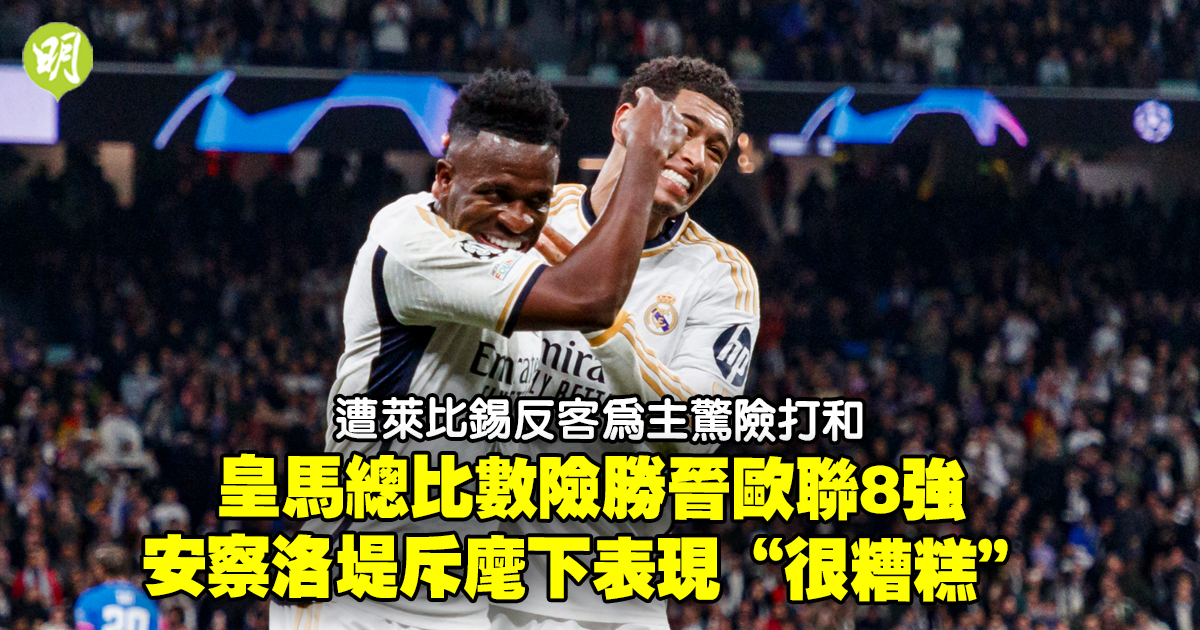 14屆歐聯冠軍皇家馬德里今晨(7日)在16強次回合比賽,被客軍RB萊比錫狂攻卻又屢誤戎機下,最終保住1:1賽果,並藉首回合的1球優勢,以總比數2:1險勝,近14季第12次晉身8強,而教練安察洛堤賽後則直認麾下表現很糟糕。