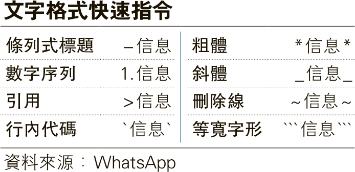 WhatsApp另一個新玩法,是在短訊內容前後加入指定符號,便可以將短訊字體變成粗體、斜體或加上刪除線等。有興趣的話可以跟隨附表,試試各種效果。●