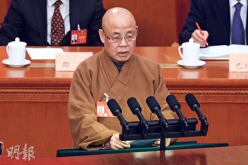 【明報專訊】中國佛教協會會長演覺昨(9日)在全國政協十四屆二次會議第三次全體會議發言時表示,愛國愛教是中國佛教及中國各宗教的優良傳統,推進「宗教中國化」應是首要任務。他還指出,要促進中國各宗教在教義教規、管理制度、禮儀習俗、行為規範等方面不斷形成新時代中國特色。