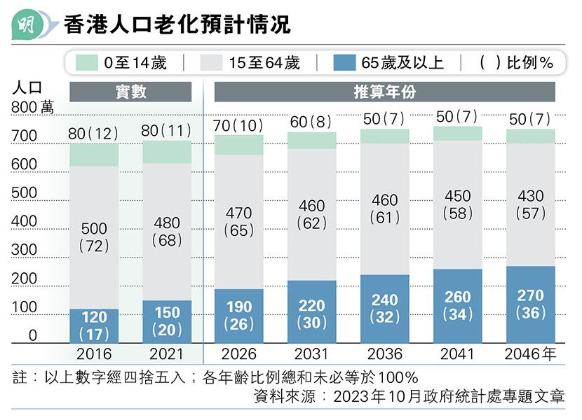 【明報專訊】前任及現任財政司長最近就本港是否進入結構財赤隔空爭論,曾任財庫局長的馬時亨強調自己多年來「不在其位,不謀其政」,但認為香港人口老化確是結構問題,而且必定影響政府財政,「人口老化可能會令醫療支出飈升。香港又奉行薪俸稅,如果薪俸稅愈來愈少,『鯊魚口』就會變大,如何補上該缺口才是問題」。據政府統計處推算,香港2046年65歲及以上佔總人口比例將增至近四成(見圖)。
