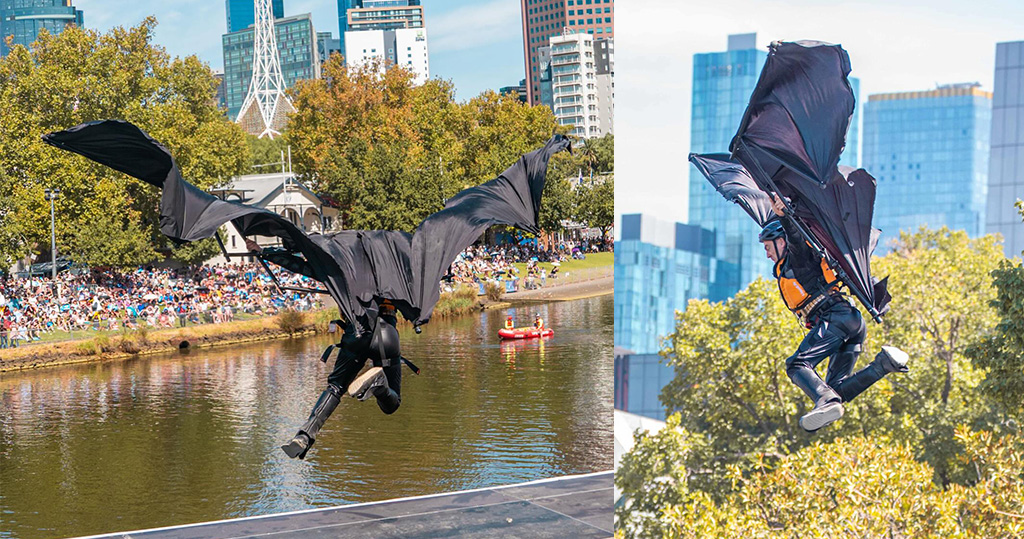 澳洲墨爾本周日(10日)舉行年度鳥人大賽2024 Moomba Birdman Rally,一眾參加者以各式造型亮相,有人扮成蝙蝠俠、巨鷹等,揹上自製的飛行「翼」,自4米高台飛躍出外,直至墮進河中,以距離最遠者為勝,而參加者趣怪的「飛行」姿態亦引起在河邊的觀眾笑聲不絕。