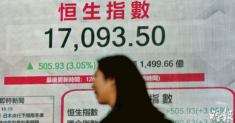 恒指昨高開114點,升幅一度收窄至25點,午後升幅擴大,最多升567點,高見17,154,收市升505點或3.05%,報17,093,是去年11月28日後收市新高,並連升3日,累升863點或5.3%。國指升3.49%,報5,949點;科指更跑贏大市,升4.6%,報3643點。