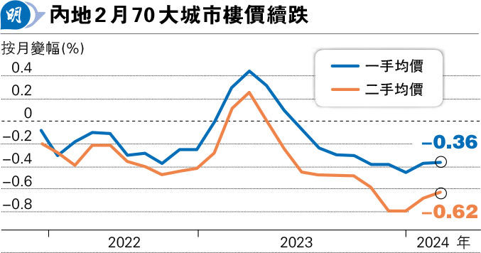 【明報專訊】國統局昨公布70個大中城市住宅銷售價格數據,據推算2月份新建商品住宅均價按月下降0.36%(見圖),較1月的下降0.37%收窄,不過,按年則跌1.9%,跌幅較1月的1.2%為高;二手住宅均價按月下降0.62%,亦較1月降幅0.68%收窄。按年計則下降5.15%,1月為下降4.45%。