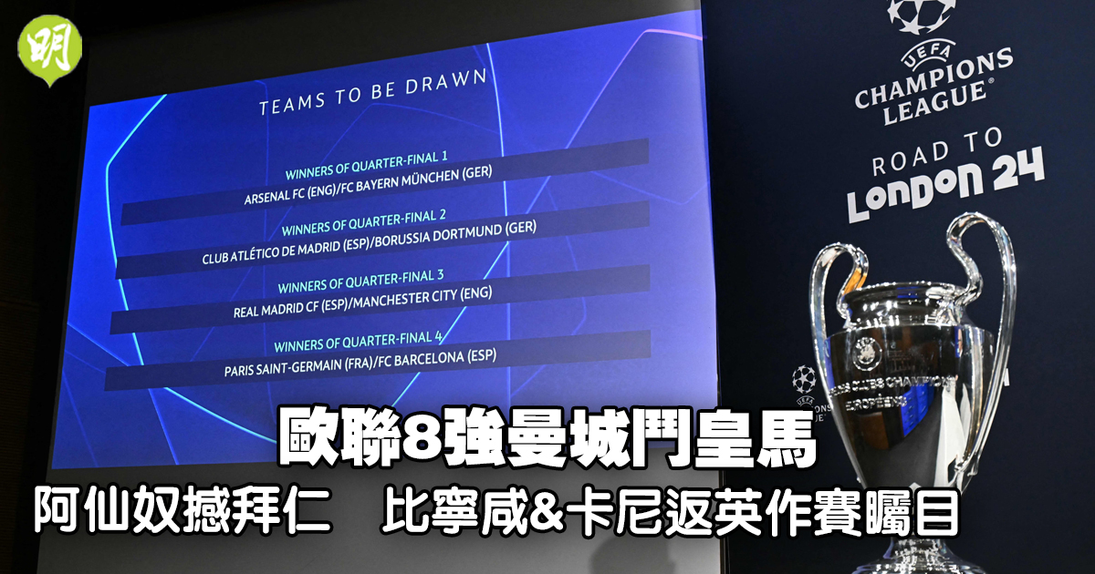 歐聯8強和4強今晚(15日) 一併抽籤(見下表),重頭戲是爭取衛冕的曼城,與14屆冠軍皇家馬德里上演去季4強戰翻版,勝出一方將與阿仙奴對拜仁慕尼黑的勝方爭入決賽,亦代表兩名英格蘭國腳皇馬中場祖迪比寧咸,以及拜仁箭頭哈利卡尼將返英作賽。至於對陣巴黎聖日耳門(PSG)的巴塞隆拿相對地抽得好籤,理由是另一組對手是馬德里體育會和多蒙特。