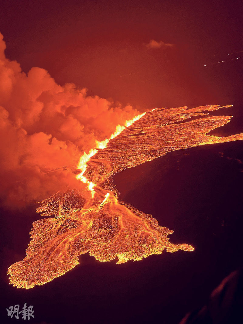 【明報專訊】冰島氣象局上周六(16日)表示,冰島西南部雷克雅內斯半島(Reykjanes Peninsula)的火山上周六晚約8時爆發,是自去年12月以來第四次,向空中噴出的煙霧和橙色熔岩與漆黑夜空形成鮮明對比。冰島南部已宣布進入緊急狀態。人們也已從附近著名景點藍湖疏散。這相信是迄今為止最強烈的爆發。冰島氣象局表示,熔岩似快速流向附近漁村格林達維克(Grindavik),當地4000居民有些已在上次爆發後回鄉。冰島空域昨仍然開放,首都雷克雅未克的凱夫拉維克機場(Keflavik airport)未受影響。