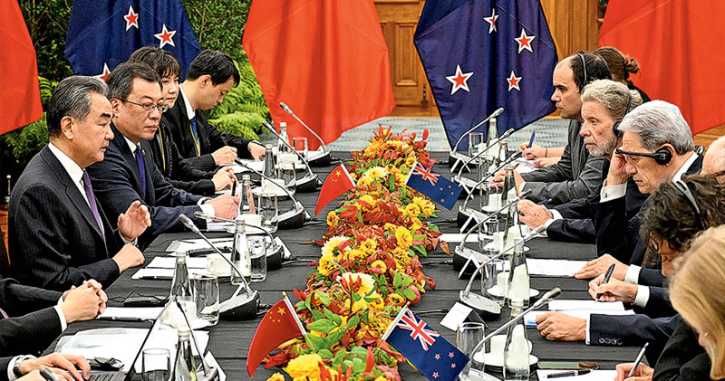 【明報專訊】中共中央政治局委員、外交部長王毅昨(18日)在新西蘭惠靈頓分別會見紐副總理兼外長彼得斯(Winston Peters)、總理拉克森(Christopher Luxon)及貿易部長麥克萊(Todd McClay),開啓一連5日的紐、澳正式訪問行程,就經貿、地區安全、氣候變化等議題舉行會談,下一站將前往澳洲,與澳外長黃英賢、總理阿爾巴尼斯等人會晤,更特別邀請前總理基廷。