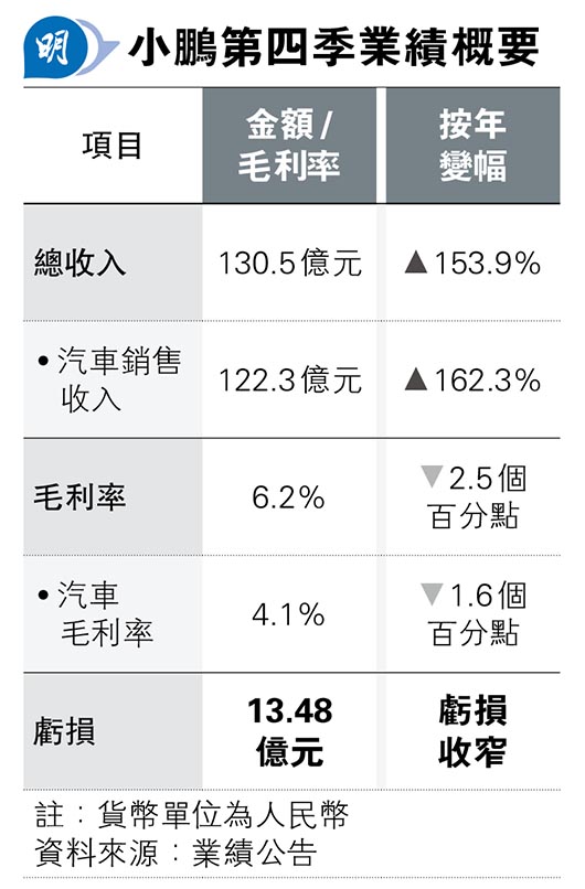小鵬上季虧損收窄至13.5億 毛利率降