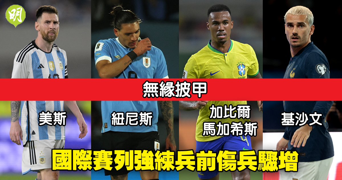 歐洲主要聯賽殺入直路階段,國際賽檔期卻即將開戰。英超爭標球隊利物浦及阿仙奴,今晨(19日)分別有前鋒達雲紐尼斯與守將加比爾馬加希斯,因傷無緣代表烏拉圭和巴西隊出征,西甲馬德里體育會亦有法國隊鋒將基沙文避戰。另阿根廷足總證實,上月初在港「失場」的國際邁阿密球星美斯,因傷缺席在美國舉行的兩場友賽。