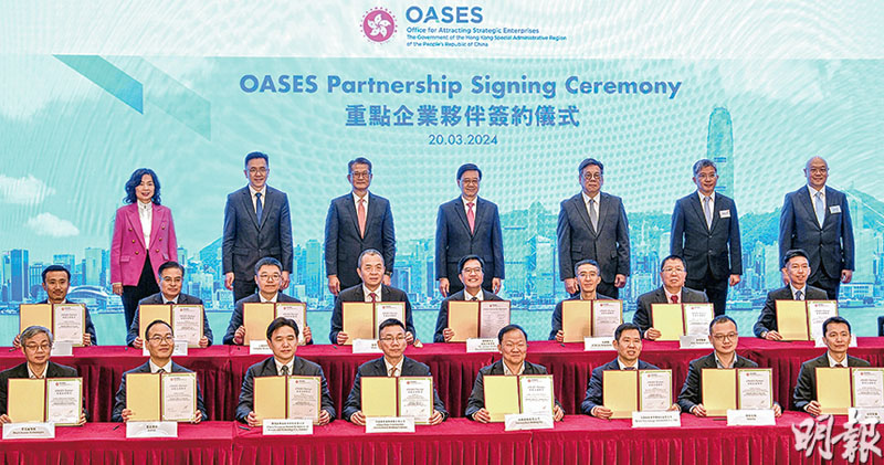 【明報專訊】政府昨第二次舉行「重點企業夥伴簽約儀式」,共25間重點企業簽約,涵蓋生命健康科技、人工智能及新能源科技等。特首李家超提到,兩批約50間來港營運或擴展業務的重點企業,將為本港經濟帶來逾400億元投資,未來幾年創造約1.3萬個就業機會。財政司長陳茂波透露,「引進重點企業辦公室」今年將接觸全球300多個重點企業,相信未來數月內會達成更多合約。《基本法》23條立法剛於前日通過,法例周六將刊憲生效,昨日受訪的重點企業均認為立法有助提供更穩定營商環境,確保企業在安全及可持續環境下發展。
