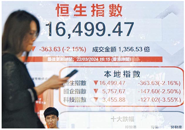 跌幅最大的藍籌股東方海外(0316)曾低見98.4元,跌17.8%,收市仍跌16.7%,至99.7元,失守「紅底股」身分,市值蒸發約132億元。集團去年純利跌86%兼減派息,摩根士丹利更預測股價在30日內有70%至80%機率回落,給予「減持」評級兼目標價75元,令沽壓增大。藍籌跌幅亞軍京東健康(6618)遭建銀國際下調目標價至43.9元,股價下跌12.6%,至28.05元。