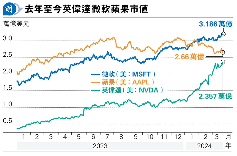《Money Monday》統計,若以去年至今市值增長計,上述美國龍頭科技股中,以英偉達及微軟表現最勁,當中,英偉達市值由2022年底的3595億美元勁升近2萬億美元至上周的2.357萬億美元,成為全球第三大市值上市公司,期內市值增長之快料稱冠全球上市公司;微軟期內市值則由1.788萬億美元增加1.398萬億美元至3.186萬億美元,故今年1月已取代蘋果成為全球市值最大的上市公司至今(見圖)。以上周五收市價計算,英偉達及微軟預測市盈率分別高達38.2倍及36.7倍。