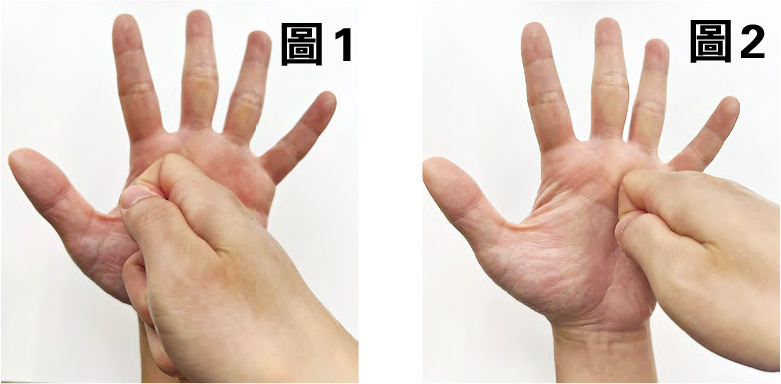 動作:用另一手的食指關節,上下按壓患側手指關節的兩旁,每邊約半分鐘。注意應緩慢地按壓,不要太快(圖1、2)