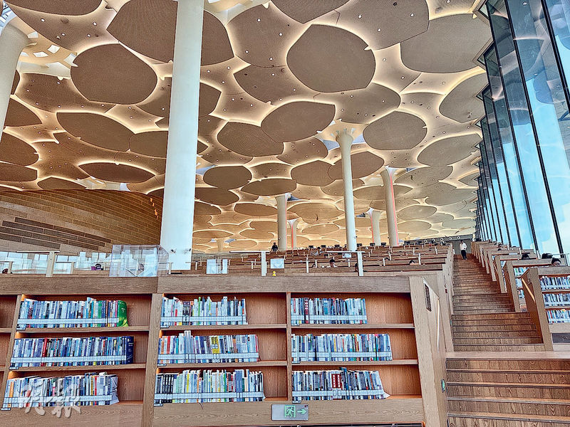 除了「硬科技」,圖書館設計將生態與傳統美學結合,建築主體由144棵搭載光伏板的「銀杏樹」撐起,這「樹冠」的天窗安裝了光伏系統,還能發電,年發電量約為25萬度。館內兩座書山線條綿延。沿着山間閱覽區拾階而上,無數書籍陳列兩側。