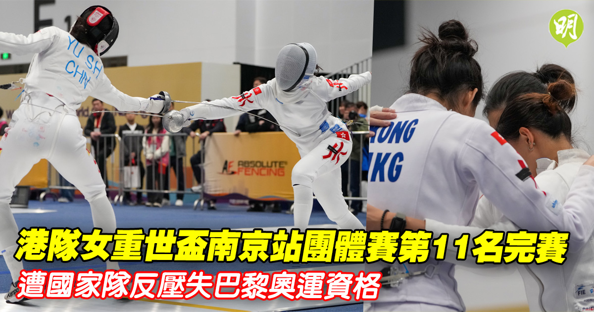 女子重劍世界盃南京站今(24日)煞科,港隊在爭取巴黎奧運資格關鍵戰,於團體賽16強以33:45不敵國家隊,最終以第11名完賽。而國家隊則於主場再連退韓國及烏克蘭隊殺入決賽,令港隊篤定被對方壓過失去亞大區首名席位,緣盡巴奧。