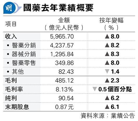 期內,收入按年增8%至5965.7億元(見表),其中醫藥分銷業務收入升8.2%至4237.57億元;器械分銷收入增加8.3%至1295.84億元;以及醫藥零售收入升8%至349.86億元。而集團去年毛利按年升2.3%,至485.12億元,毛利率則略為下降0.5個百分點至8.13%。