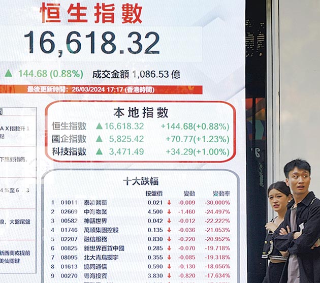 【明報專訊】內地股市由跌轉升、離岸人民幣轉強、「北水」重新流入,都帶動港股昨天先低後高,終止兩個交易日下跌。恒生指數高開74點,早段升179點後中午前一度倒跌,午後跟隨內地股市重拾動力,最多升255點,收市升144點,報16,618點,成交1086億元,雖然續逾千億元,但較周一減少3.6%。國企指數和恒生科技指數皆跑贏大市,國指升1.23%,收報5825點。科技指數升1%,報3471點。