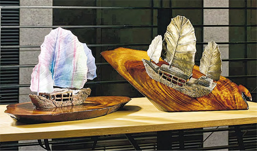 鑄銅工藝師廖榮想把自己的經驗和技術傳授給年輕混合媒介雕塑創作者林繁盛,後者再把傳統的鑄銅技術融入自己作品中。展覽中有幾件糅合二人經驗的共同創作作品,展示他們受中國傳統和工藝啟發的合作成果,其中最吸引眼球的是二人合作的船形雕塑。廖榮想說:「我在製作前收集了很多樹葉,樹葉好似人的指紋,有不同紋理,收集之後就要盡快開始工序,因為葉很脆弱,不可以讓它皺,要趁它仍然新鮮。」林繁盛補充:「在做模過程中,葉不可以有任何變形,師父會找兩塊樹葉夾住,讓它有足夠厚度,做到矽膠倒模。然後在模具入面加入蠟製成蠟雕。師父會在這個蠟的形態上面修改,塑造他心目中想要的形態,然後繼續餘下的『失蠟鑄造』工序。」