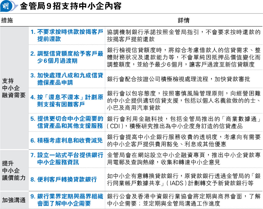 【明報專訊】金管局昨聯同「銀行業中小企貸款協調機制」宣布推出9項措施,以支持中小企融資需要、提升中小企議價能力,以及加強雙方溝通,包括承諾客戶按時還款不call loan,以及縮減信貸額度時給予最少6個月過渡。金管局表示,中小企是香港經濟的重要基石,參與協調機制的11家銀行去年共批出超過11萬筆貸款予中小企客戶,涉及授信總額超過4500億元。