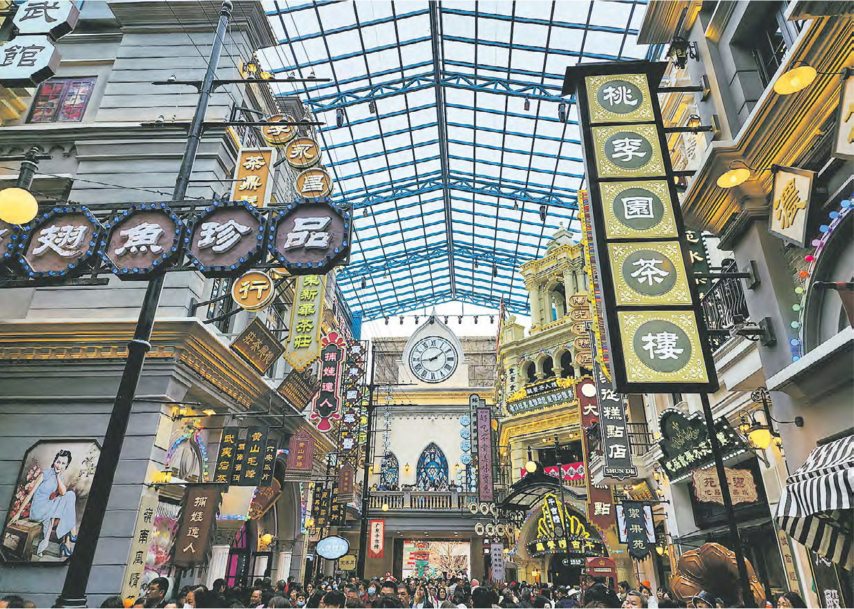 走過大舞台,來到古色古香的「穿越街」,整條大街設有有如上世紀初省城大街上的招牌商號、歐式羅馬數字大鐘,人們熙來攘往的模樣,彷彿將昔日廣州西關最繁華的上下九路搬到這裏,難怪人人爭相拿起手機打卡。穿越街兩旁的店舖,有些是布景,有些是真實在經營的店舖,如胭脂水粉店賣復古包裝雪花膏,亦有武術主題商店等,部分建築的2樓亦設有餐廳,方便大家醫肚。