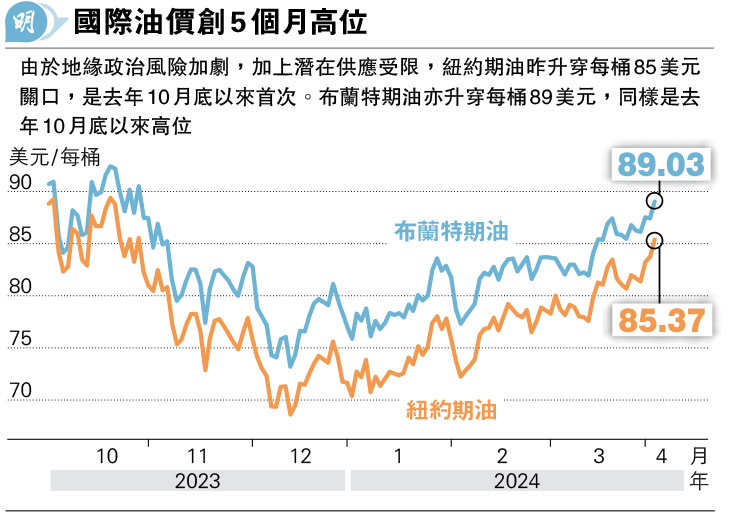 【明報專訊】以色列空襲伊朗駐敘利亞大使館導致多名軍事顧問死亡,恐引發伊朗報復,令中東地緣政治風險升溫。加上墨西哥供應趨緊,且美國製造業活動恢復擴張預示原油需求增加,國際油價昨升至5個月高位。紐約期油昨升穿每桶85美元關口,是去年10月底以來首次。布蘭特期油亦曾升穿每桶89美元,同樣是去年10月底以來新高。美國製造業數據比預期強勁,令市場下調對美聯儲的減息預期,美股三大指數早段下挫,道指繼周一跌逾200點,昨早段再跌450點,標普500指數及納指早段跌約1%。