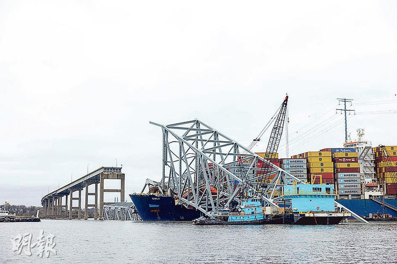 【明報專訊】美國巴爾的摩市弗朗西斯•斯科特•基大橋因3月26日被貨櫃輪撞擊橋墩而坍塌(圖),導致6名修路工人墮河喪生、帕塔普斯科河航道被堵。當局作有限度清除,周一(1日)首度開放橋北一邊限制深度為3.35米、闊80米的水道予處理事故的小型船舶及局部受困的駁船、拖船使用。當局在加緊清理現場,準備在未來數天內,開放橋南供吃水不超過4.6米至4.9米的船舶。至於第三條航道計劃水深6.1米至7.6米,將可讓幾乎所有受困的駁船、拖船使用。