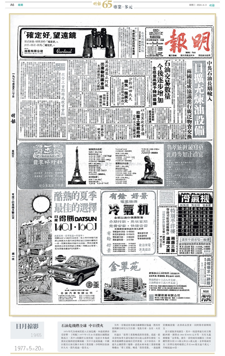 【系列前言】1970年代全球兩度陷入石油危機,本港經濟亦受影響。《明報》1977年5月20日頭版以國際新聞為主,其中4則關於石油資源,包括日本執政黨決定協助建造煉油廠,另中日達成協議,中國以煤及石油交換日本的工業設備;沙特阿拉伯油田大火,損失超過一億美元。(編輯部)