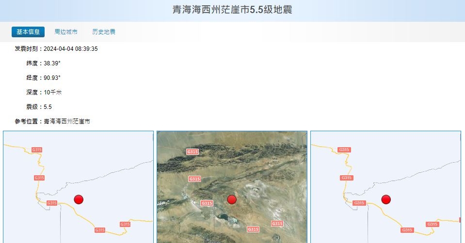 即時兩岸 青海海西州5.5級地震 有民眾稱震感強 (10:28) 發佈於 2 年 前 2024 年 4 月 4 日 By 明報 【10:28更新】中國地震台網測定,今早(4日)8時39分在青海海西州茫崖市附近,發生5.5級地震,位置在北緯38.39度,東經90.93度,震源深度10公里。 中新社報道,根據移動人口大數據分析,震央20公里範圍內人口數約1.1萬、50公里範圍內約1.3萬、100公里範圍內約2萬。今次地震周邊20公里內的鄉鎮有花土溝鎮。 據茫崖市民眾反映,今早地震震感強烈,屋內吊燈晃動劇烈。茫崖市委宣傳部工作人員向中新社表示,暫未接獲傷亡報告。(中國地震台網/中新社) 相關文章:地震編輯推介青海 Up Next 花蓮立委家中雜物遍地體會無助 籲堅毅修復家園 (15:46) 不要錯過 花蓮地震25年來最強 高鐵捷運一度停駛 蘇花公路山崩、龜山島崩落【短片】 (10:37) 繼續閱讀 贊助商 猜你喜歡 阿富汗北部地震 最少20死500傷 【東京】鏡頭下的震災重生敘事 雲南普洱市景谷縣發生3.6級地震 (16:25) 話你知:熱門線78公里行4天 多入口搜救存難度 青海老虎溝行山者被困 1人遇難 137人獲救 (13:54) 青海門源縣通告 嚴禁穿越祁連山禁區 (21:58)