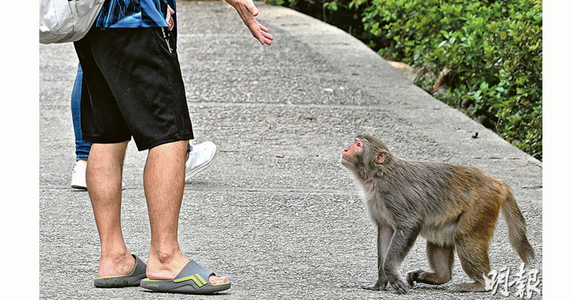 本報記者昨到金山郊野公園觀察,仍有遊人與野猴接觸。漁護署同日出稿,呼籲市民切勿在猴子面前進食,避免直視猴子眼睛,免被視為挑釁。
