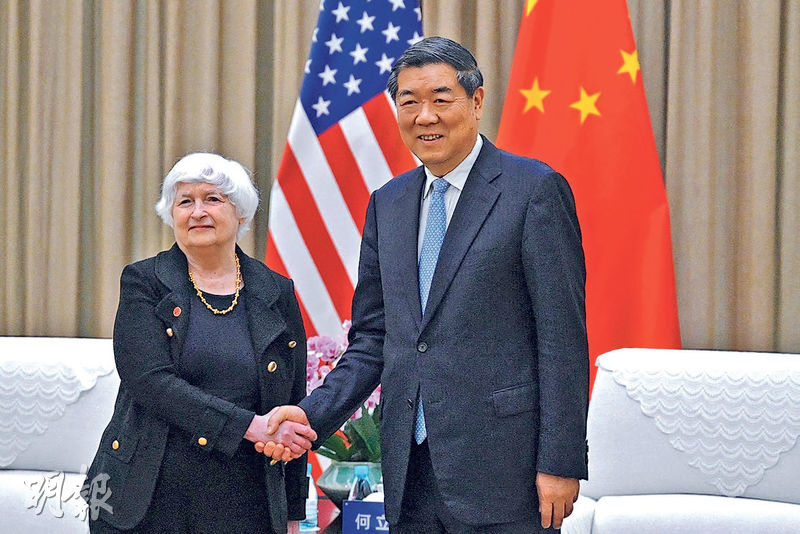 【明報專訊】正在訪華的美國財長耶倫(Janet Yellen)昨(6日)與中美經貿雙方牽頭人、中國國務院副總理何立峰在廣州為期兩天的多輪會談結束。中方就美方對華經貿限制措施表達嚴重關切,並就產能問題作出回應。耶倫透露,雙方同意就中美及全球經濟平衡增長討論,並將共同打擊洗錢和非法金融活動。她昨稍晚赴北京,預計今天與國務院總理李強會面,接下來還將會晤財政部長藍佛安、人行行長潘功勝等官員及前副總理劉鶴。