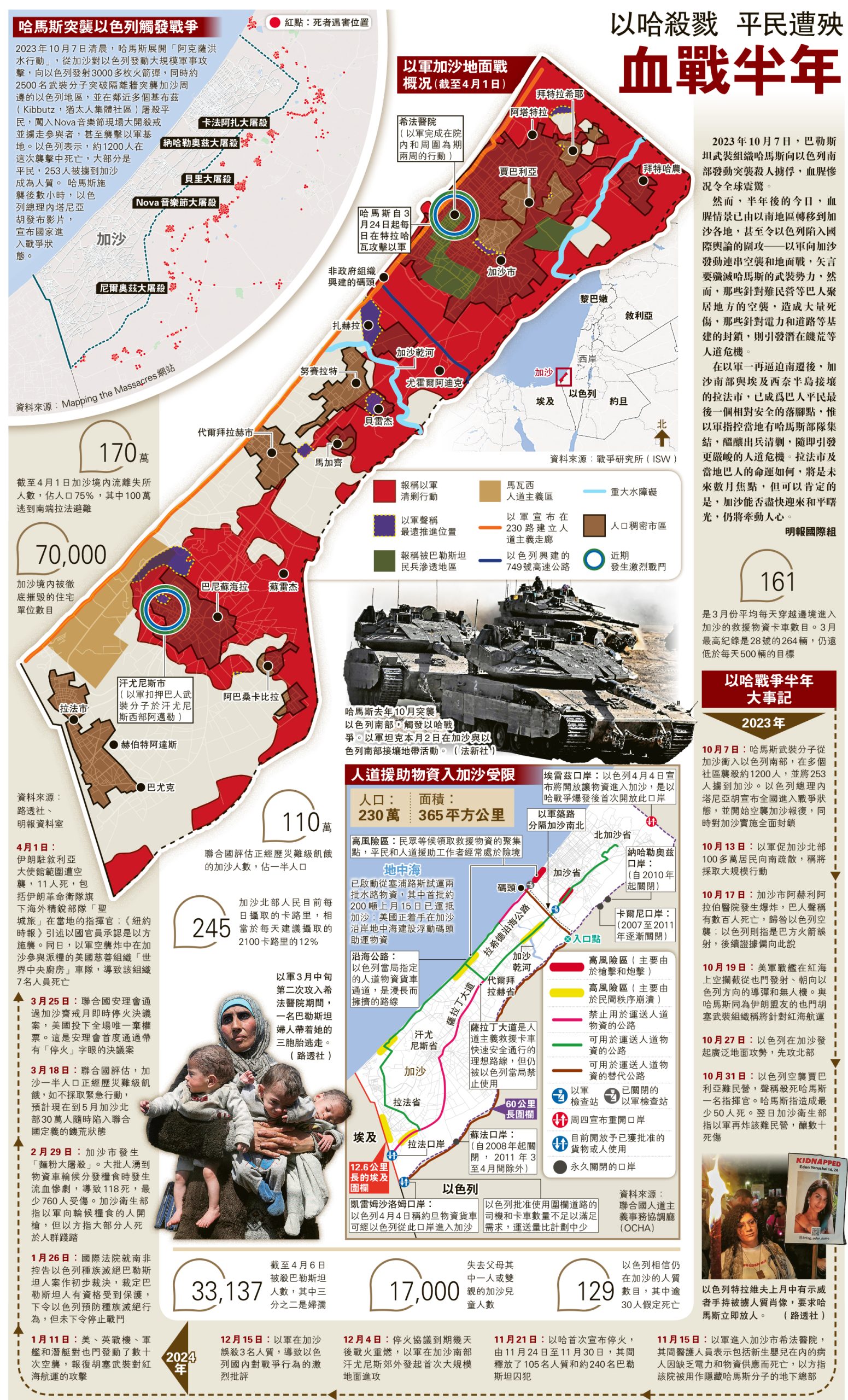 然而,半年後的今日,血腥情景已由以南地區轉移到加沙各地,甚至令以色列陷入國際輿論的圍攻——以軍向加沙發動連串空襲和地面戰,矢言要殲滅哈馬斯的武裝勢力,然而,那些針對難民營等巴人聚居地方的空襲,造成大量死傷,那些針對電力和道路等基建的封鎖,則引發潛在饑荒等人道危機。