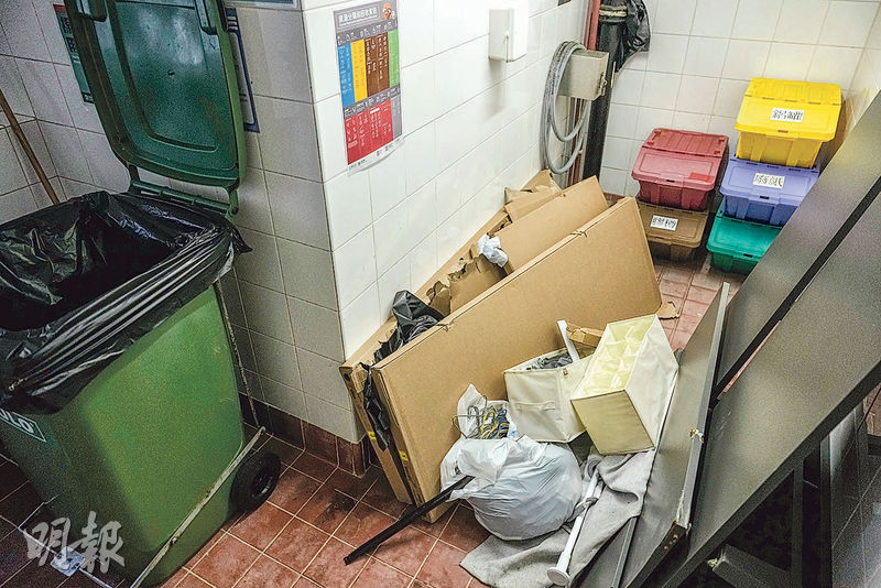記者昨午到連翠邨12至24樓後樓梯觀察垃圾桶,點算共19袋垃圾中,有9袋使用指定袋,而大廈樓層的大型垃圾桶套上普通黑色膠袋。各樓層垃圾房也設有分類回收箱,惟有住戶把可回收物料如紙皮、膠盒和紙盒放在回收箱前方;有住戶把大型家俬棄置垃圾房,而垃圾房外有棄置大型垃圾告示,指居民須自行將大型垃圾棄置於約10分鐘路程的祥利街垃圾收集站。