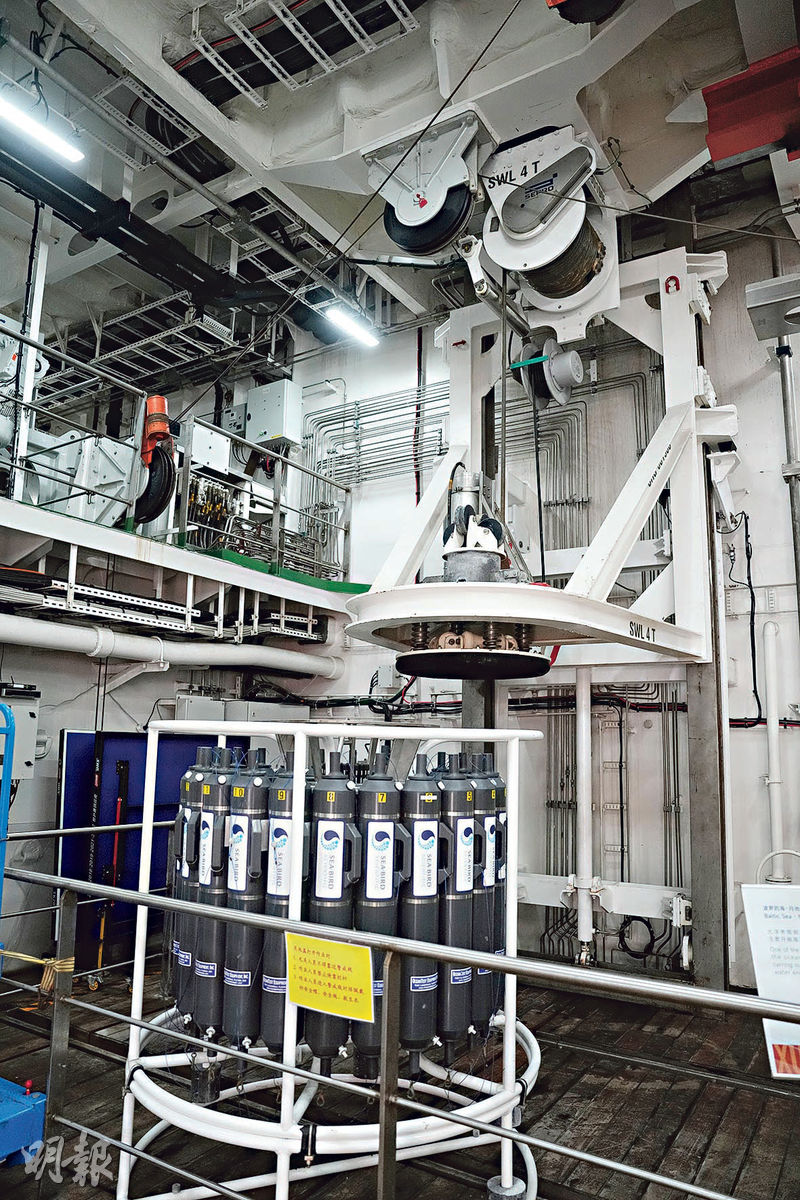 【明報專訊】「雪龍2」去年11月起展開長達5個多月的中國第40次南極考察後,昨日起訪港。本報記者昨登船參觀,船上搭載大量先進儀器及系統,包括月池車間系統,科研人員可打開船內甲板,利用吊運系統,將採樣用的裝置由船底閘門直接吊落深海,調查及蒐集海洋水體及環境樣本,吊索長1萬米,可放到幾千米深水底採樣。蒐集的樣本後會送往系統旁的實驗室處理,之前的南極任務採集了棘蛇尾、南極大磷蝦、南極深海鮭及柳珊瑚等。
