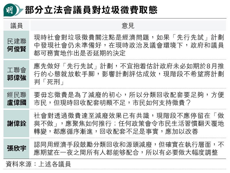 【明報專訊】垃圾徵費是否如期8月1日實施存在變數,立法會大會明日將會由內委會主席李慧琼動議察悉議案,討論政府早前提交將垃圾徵費及建築廢物徵費押後至8月1日實施的兩項附屬法例。立法會不同黨派對是否如期推行徵費取態各異,民建聯何俊賢認為,如「先行先試」後發現效果仍不理想,再度押後是其中一個選項。工聯會郭偉強認為應先做好「先行先試」計劃,不宜抱着估計未必會於8月1日推行就放軟手腳,影響計劃評估成效,又指現階段不希望將計劃判「死刑」。