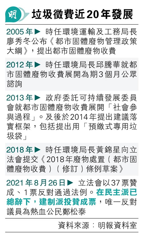 翻查資料,2021年立法會通過垃圾徵費法例時民主派議員已經總辭,有37名建制派議員都投贊成票,唯一投反對票嘅議員係熱血公民鄭松泰。唔少網民討論,有人留言反問「咁建制派又投贊成票?」,亦有人話「當年環境(運輸及工務)局局長廖秀冬話要收架喎!佢係反對派?」