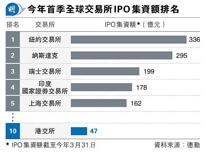 德勤中國資本市場服務部昨發布內地與本港新股市場首季分析,今年首季全球IPO集資額排名首頭五名為紐交所、納斯達克、瑞士交易所、印度國家證券交易所及上交所,其融資額分別為336億元、295億元、199億元、178億元及162億元。香港方面,德勤指季內只有小型新股上市,季內沒有任何中概股回流上市,2月期間沒有任何新股在港上市。