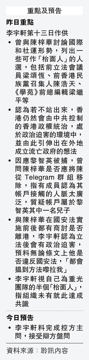 【明報專訊】壹傳媒創辦人黎智英及《蘋果日報》3間相關公司涉串謀勾結外國勢力案昨第56日審訊。李宇軒供稱,2020年7月他與陳梓華商討由誰擔任用真名行事的「枱面人」,作國際游說乃至成立流亡政府,不過最終沒有合適的人選。法官問當時國安法已生效,為何李還想「浮上枱面」,李回答當時他認為「已經跌落一個有政治迫害嘅環境入面」,形勢「已經夠差」,他在這個背景下提出成立流亡政府的想法。