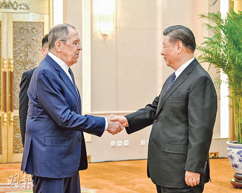 【明報記者】國家主席習近平昨下午在在北京人民大會堂會見俄羅斯外長拉夫羅夫。習近平表示,中俄兩國攜手走出了一條大國、鄰國和睦相處、合作共贏的嶄新道路,造福了兩國和兩國人民,也為國際公平正義貢獻了智慧和力量。昨天,中共中央政治局委員、外交部長王毅也在北京同拉夫羅夫舉行會談。