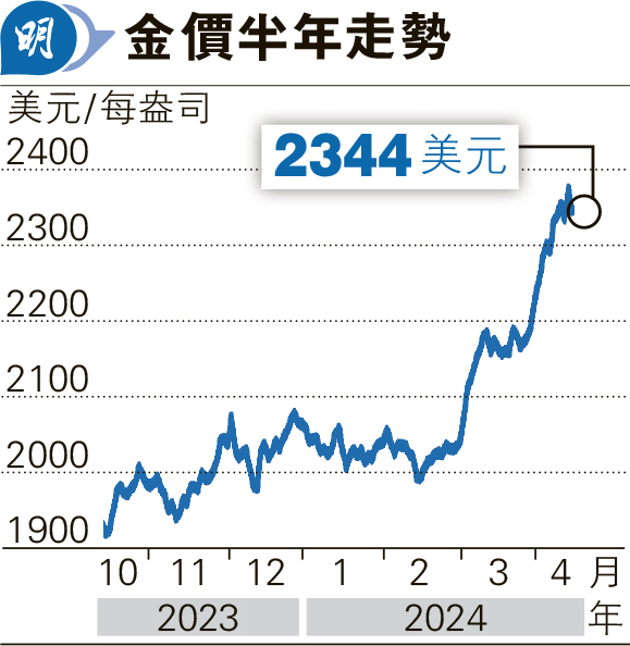 【明報專訊】上周五傳出伊朗或將襲擊以色列,進一步推升避險資產,金價上周五晚上一度升穿每盎司2400美元,創下2431美元歷史新高,但收市前有獲利回吐,全日倒跌1.18%報2344美元(見圖),總結全周仍升0.64%,連升第四周。美元上升通常不利金價,但上周五美匯指數升穿106,金價仍創新高,Kitco Metals高級分析師Jim Wyckoff認為,只能表明市場避險需求強勁。