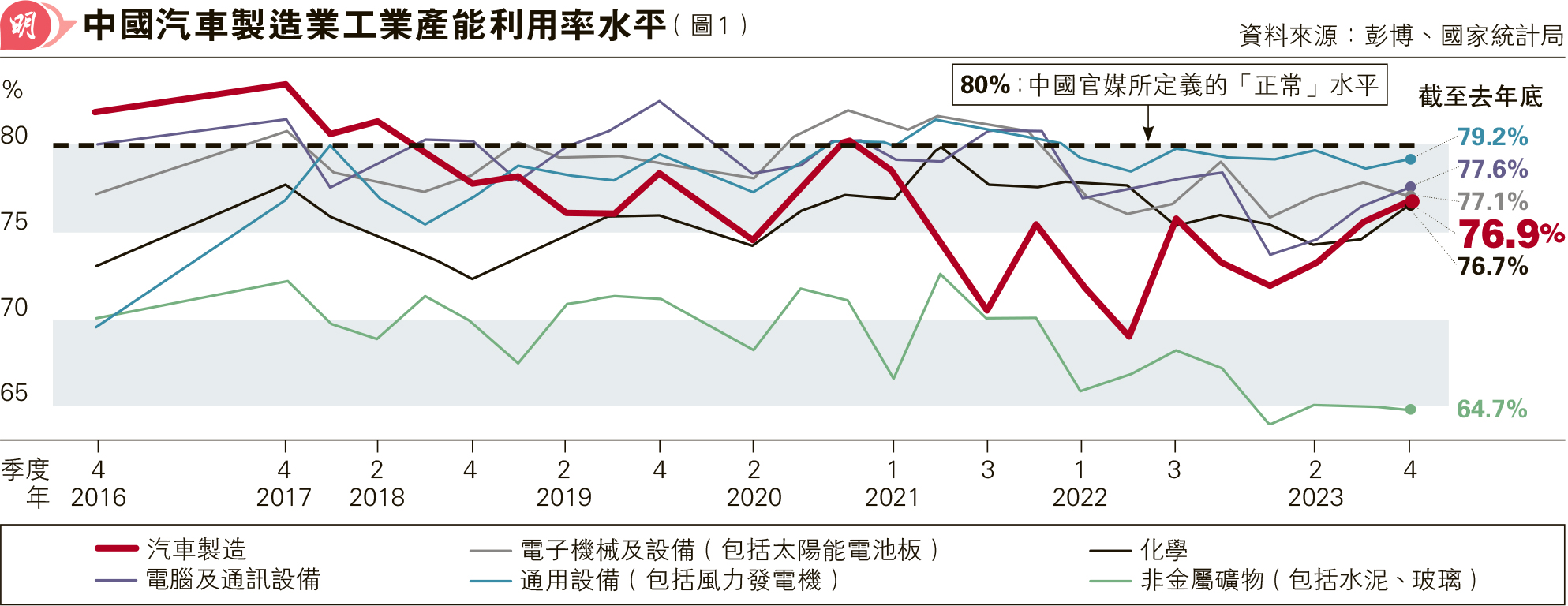 不過,彭博本月初一篇文章為中國電動車業辯護,題目是「美歐對中國產能過剩的抱怨並不盡有數據支持」。彭博文章援引中國官媒《經濟日報》文章定義,工業產能利用率以約80%為正常水平,並綜合國家統計局資料,顯示內地汽車製造業在2018年第三季前,其工業產能利用率一度超過80%,其後至今大致回落在75%水平;與其他行業如電腦通訊設備、電子機器及設備、通用設備等製造業相比,汽車製造業的工業產能利用率在中等水平,然而自去年第一季的72%起連續三季有上升迹象,去年第四季升至76.9%(圖1)。