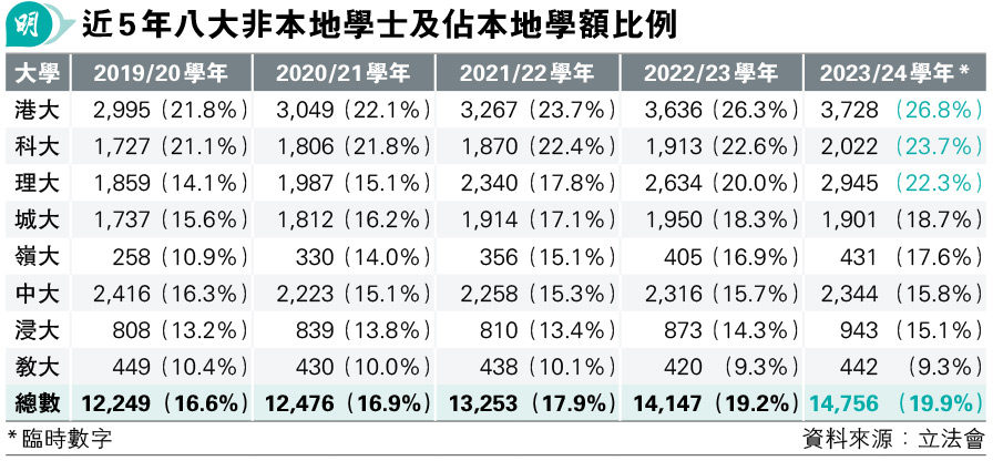 【明報專訊】今年9月新學年起,8間資助大學收非本地生的限額將翻倍,提高至「40%限額」。教育局最新數據反映八大今學年共收14,756名非本地學士生,佔學額近兩成(19.9%),4年間增2507人,升幅兩成。當中港大非本地學士生人數近5年持續超出「20%限額」,今學年收3728人,達26.8%。