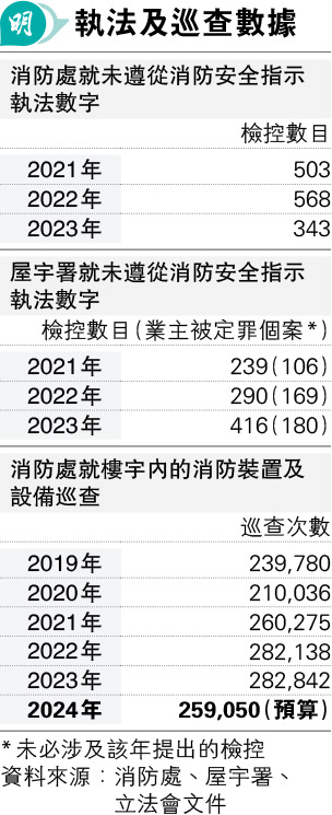 【明報專訊】經民聯立法會議員陸瀚民向消防處查詢,今年預計巡查樓宇消防裝置及設備約26萬次,較去年及前年分別約28萬實際巡查次數少(見表)的原因。消防處回應時強調今年預算約26萬次巡查,較去年原預算約23萬次巡查增加13%。處方解釋,數字不同與一籃子因素相關,包括市場對驗收新樓及大型基建消防裝置及設備的需求、因應每12個月檢查裝置及設備以發出證書,以及處理投訴而巡查等。