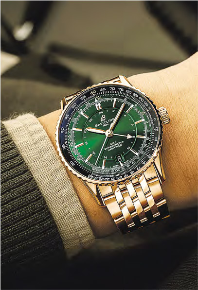 至於Cosmonaute腕表則源自1962年,當時水星七號太空人Scott Carpenter向品牌提出要求:修改Navitimer的設計令腕表適用於太空探索。Carpenter欣賞腕表的計算功能,要求使用24小時表盤,以便繞行軌道時區分白天與夜晚。腕表在1962年5月24日陪伴他出行任務,成為首款進入太空的瑞士腕表,後來命名為Cosmonaute。今次推出的限量版24小時制Cosmonaute腕表,配備品牌自製B12機芯,採用18K紅金,搭配深綠色表盤、金色數字與黑色鱷魚皮帶。底蓋記載腕表的精彩故事:“First Swiss Wristwatch in Space/Navitimer Cosmonaute May 24,1962.”●