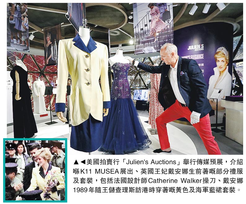 【明報專訊】英國王妃戴安娜逝世超過26年,佢生前著過嘅禮服及套裝今日起喺尖沙嘴K11 MUSEA展出,其中一套金色紐單排扣黃色西裝外套配搭直筒海軍藍鉛筆裙組成嘅套裝,由法國設計師Catherine Walker操刀,係戴安娜1989年隨王儲查理斯訪港時參觀英國海軍基地添馬艦及香港紅十字會時所著,現時估價介乎23.4萬至39萬元。